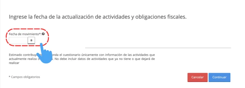 Pantalla del portal del SAT para seleccionar la fecha a partir de la cual aplicará el cambio de actividad