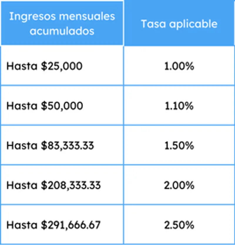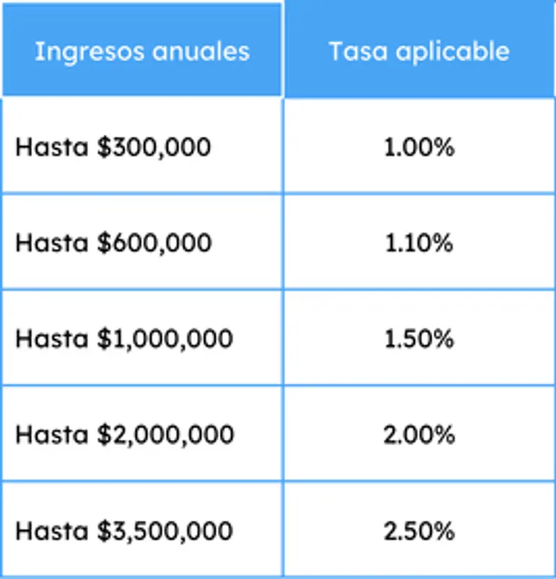 - La tasa aplicable depende de tus ingresos acumulados en el año (entre 1% y 2.5%)